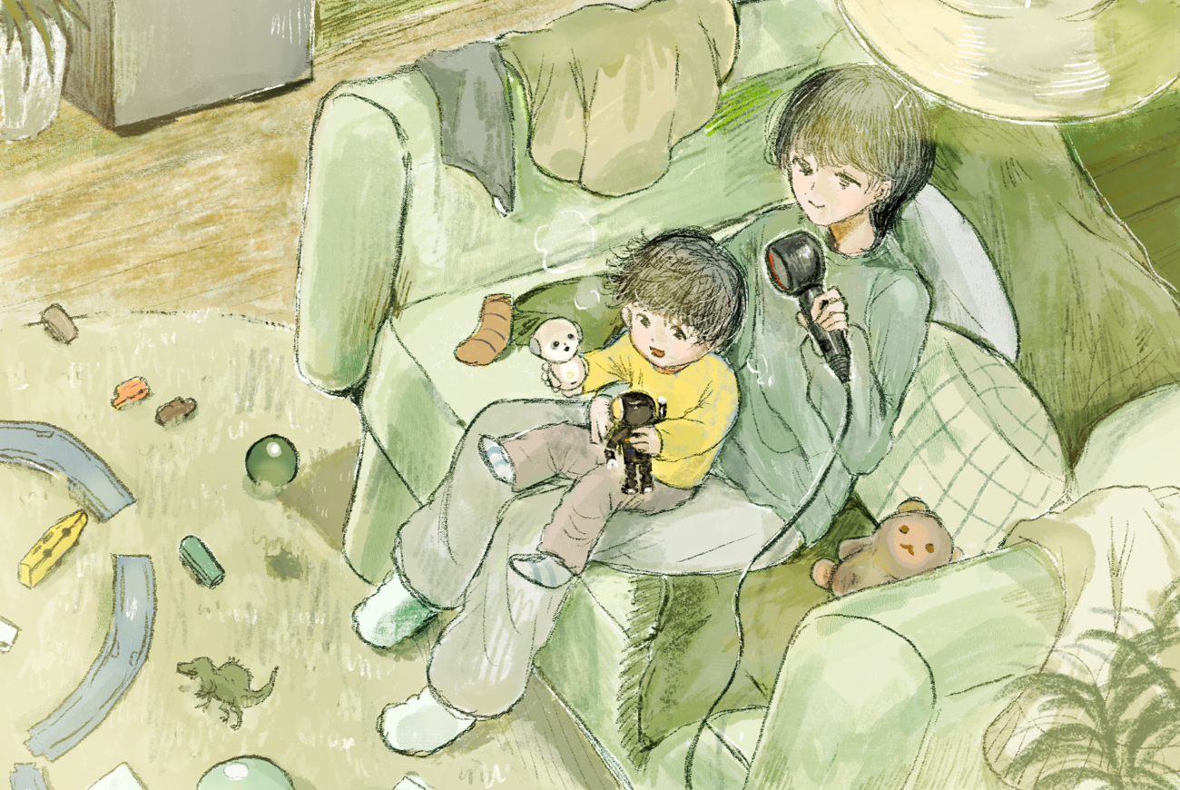 今はもうあの子も大きくなって髪は自分で乾かすし、なんならセットだって自分でするけれど、小さいときは膝にのせて乾かしてあげてたな。特別な一日じゃない、ふつうの一日だったけど、たしかにしあわせだったな。そんな日をふと思い出したとき、その思い出の中にシャープのドライヤーがあれば良いなという想いを込めました。仕事や育児で忙しいお母さんやお父さんが自分で使うにも、子どもに使ってあげるにもぴったりなドライヤーなのです。