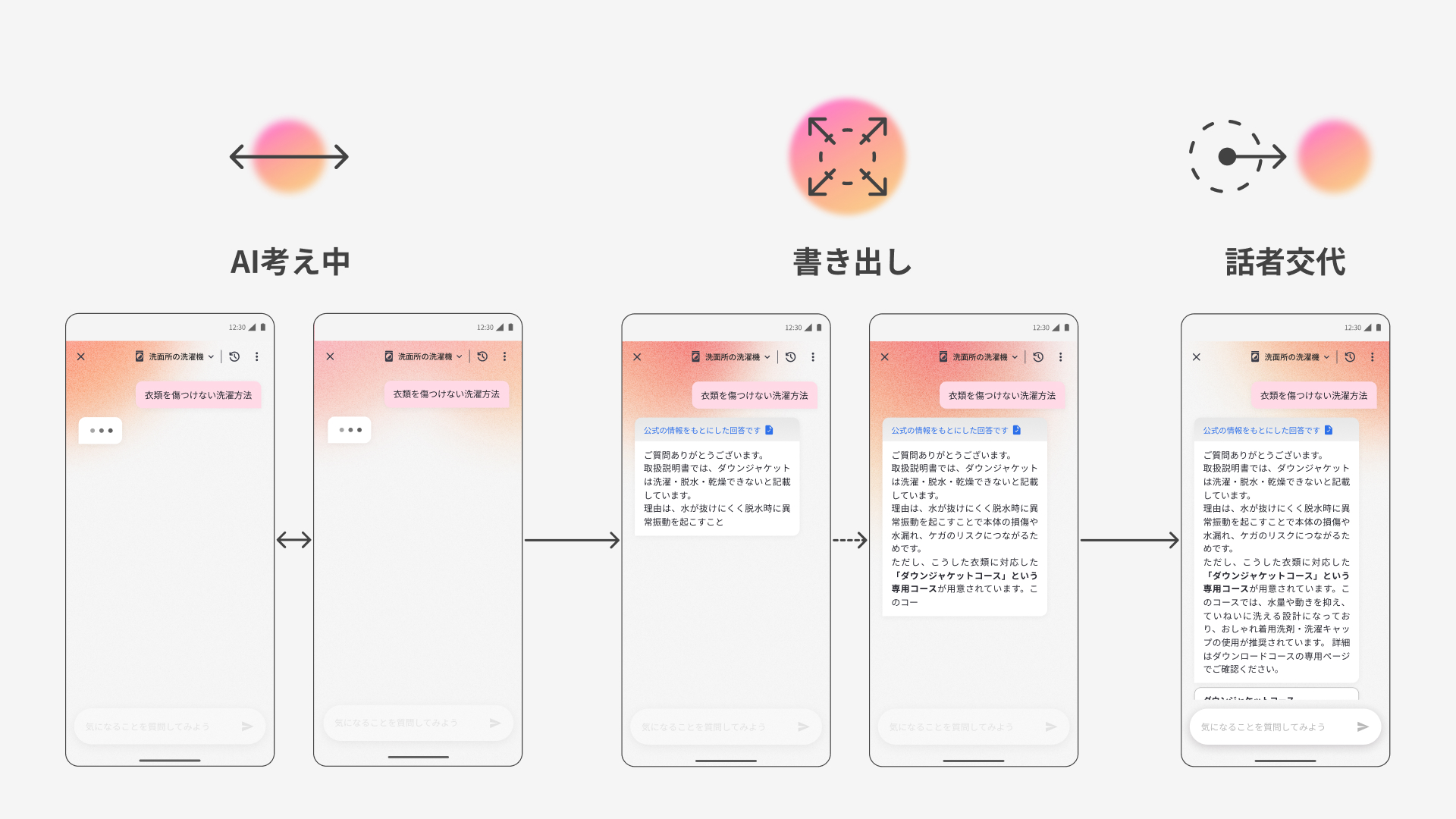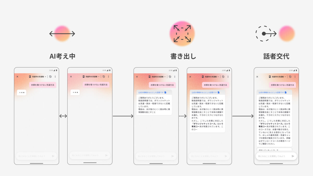 そして、ユーザーの質問に対してAIが回答を生成している時間は、背景の円形グラフィックが動くことでシステムの状態を緩やかに伝えます。
