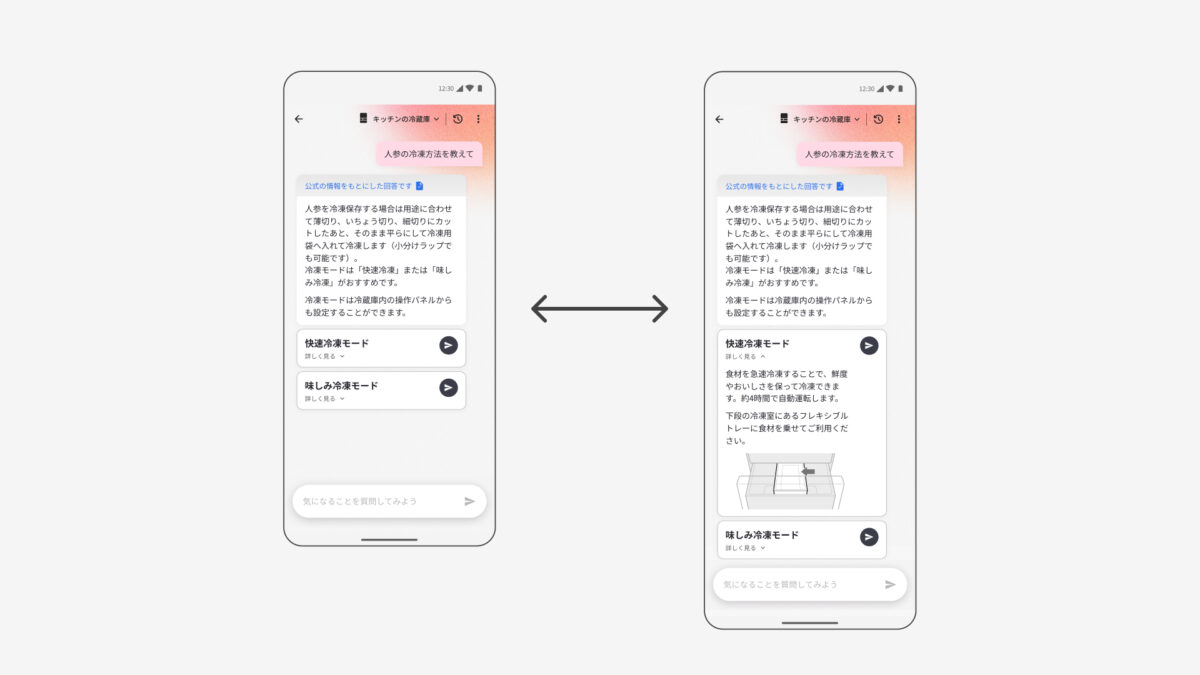 食材の保存に関する回答時、必要があれば回答内容に対応した冷凍モード設定ボタンが表示されます。ユーザーは回答内容を見た後そのままモードを変更できるわけですね。