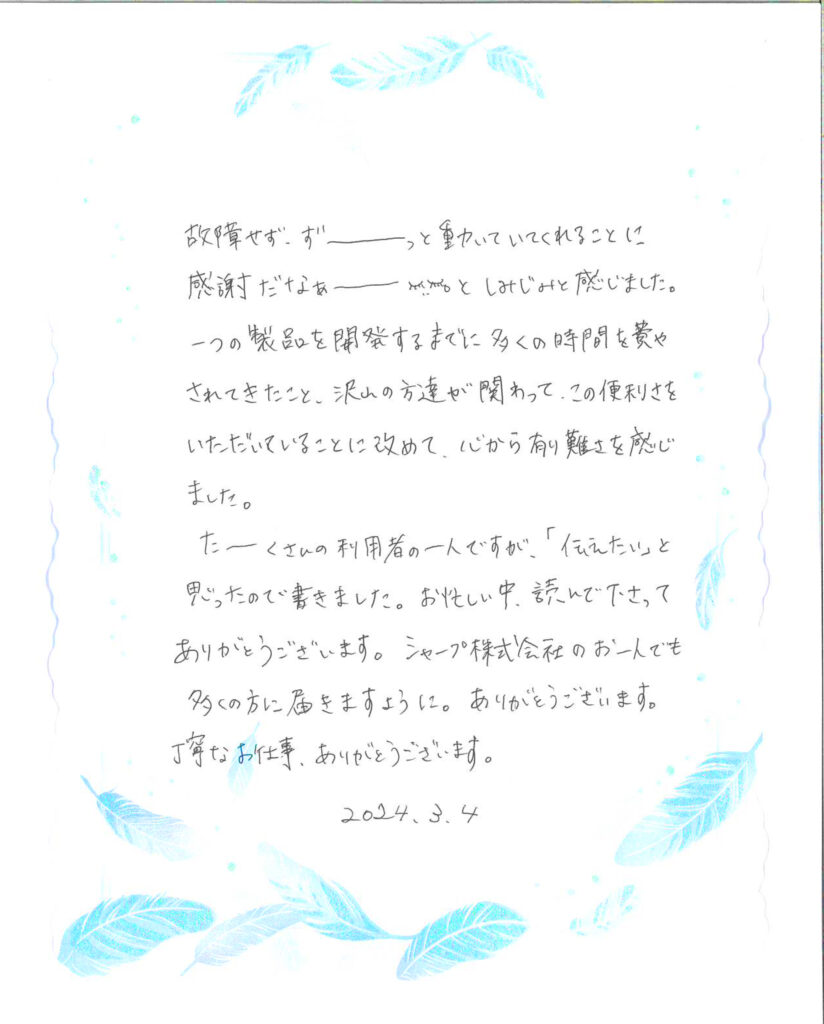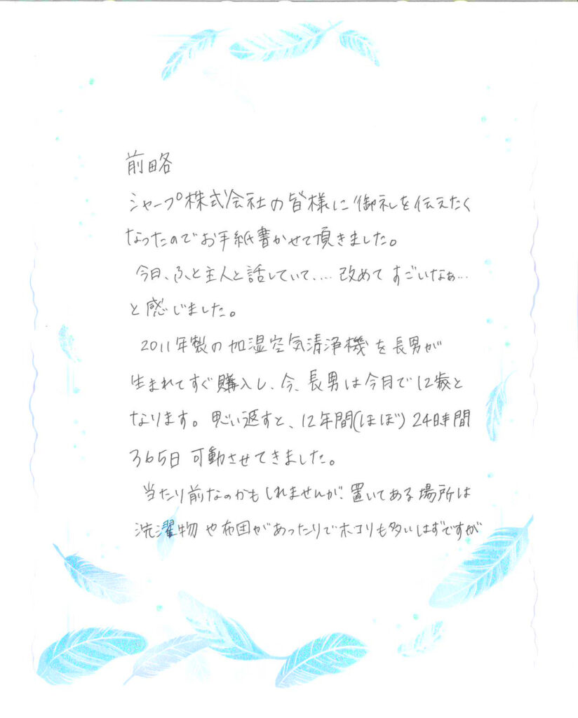 ある日、加湿空気清浄機に関する一通の手紙が届きました。