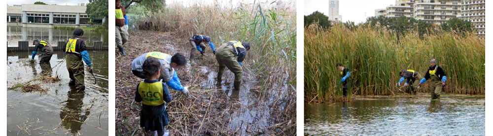 淡水池の管理は、鳥の生息環境の維持や池の遷移(陸化)を防ぐために行います。幕張SGCでは2010年から淡水池の草刈り活動に継続して参加しています。