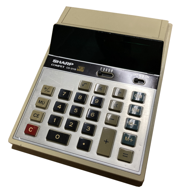開発の評価室にはオフィス電卓「コンペット」<CS-2118>が残っています。