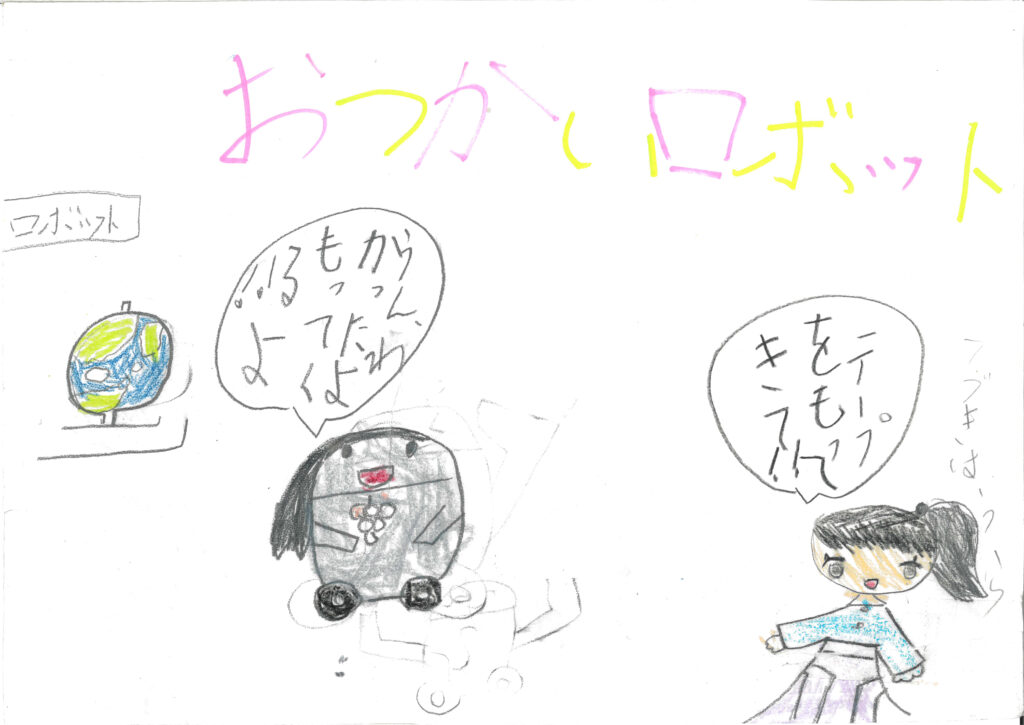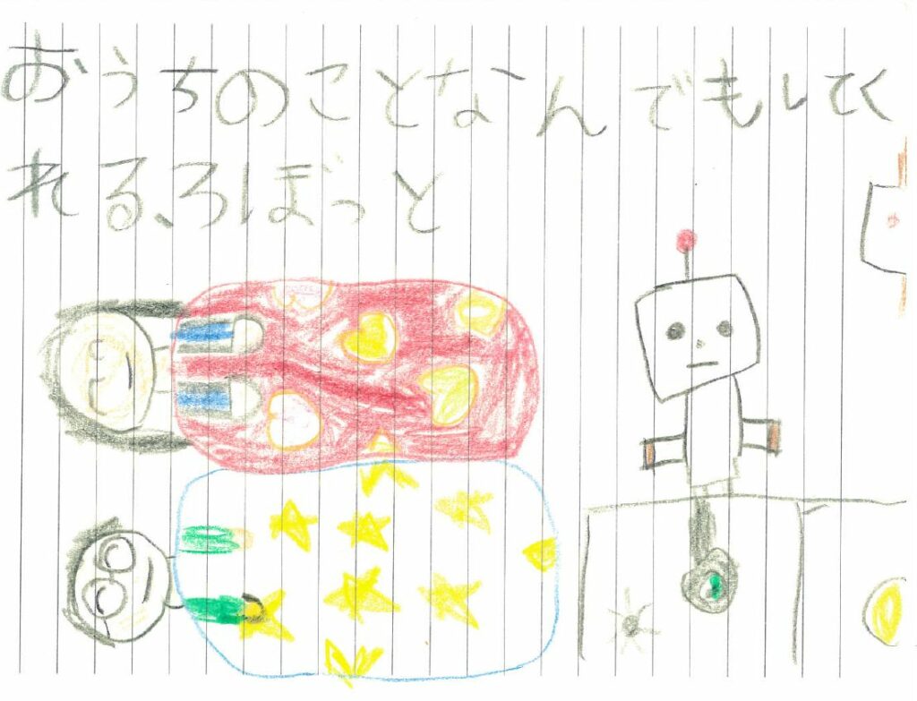 ちさきさん、すてきなロボットの絵をかいてくれてありがとう!お父さん、お母さんがいつもりょうりやお片づけをきっちりやってくれて大変そうだから、ロボットがやってくれたらいいなあということでかいてくれたのかな。やさしいね!わたしたちも、りょうりやおそうじするキカイをたくさん作ってるけど、ひとつのキカイでひとつのことしかできないから、一台でなんでもできるロボットがいたらベンリそうだね!ちさきさんのやさしい気持ちも、そのロボットにくみこめたらすてきですね!