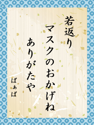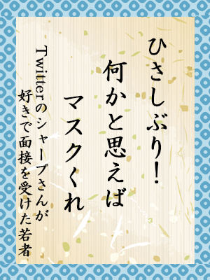 実際マスク生産に携わった経験があるからこそ詠める句なのではないかと思います。シャープのマスクに誇りを感じる、そんな一句でした。文句なし編集部満場一致の大賞でした。(川柳コーナー編集部)