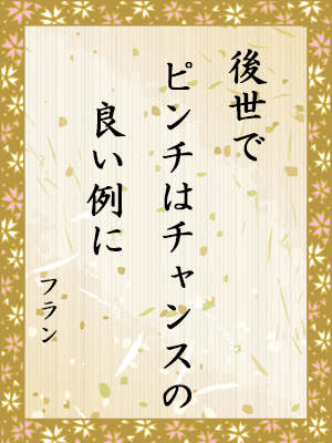コロナコロナで気の沈むことが多い昨今です。 けれど歴史を振り返ると、 戦後商売を始めて大きな企業を作った先達のように、 ピンチをチャンスに変えていった人たちは多いと思います。 同じようにこのコロナ禍をプラスに乗り越え、 未来の人に語り継がれるといいなと思います。(フランさん)